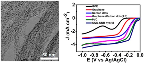 氢燃料电池以氢气和空气为燃料,不释放有毒污染物,只产生水,被认为是一种继火电、水电和核电之后的真正绿色能源。然而,目前氢燃料电池的大规模商业化应用的重大挑战之一就是发展长寿命、高活性、低成本阴极氧还原电催化剂。王舜教授课题组在以替代铂为目标的氟氯共掺杂石墨烯(Electrochim Acta, 2015, 177, 36)、氮掺杂介孔石墨烯球氧还原催化剂(Nanoscale, 2014, 6, 7204)等前期研究基础上,近期与美国凯斯西储大学戴黎明教授及加拿大温莎大学王继昌教授合作,可控制备出了一种新颖的具有目前最优活性和稳定性的石墨烯量子点/石墨烯纳米带新材料(图1)。由于所制备的新材料中不需要引入任何杂原子,其催化活性源于材料表面和边缘缺陷产生的丰富活性位点,本研究对于碳基非金属氧还原电催化剂的设计及性能优化具有重要的指导意义。研究结果发表在J. Am. Chem. Soc.,2015,137(24), 7588 (影响因子12.1)上。