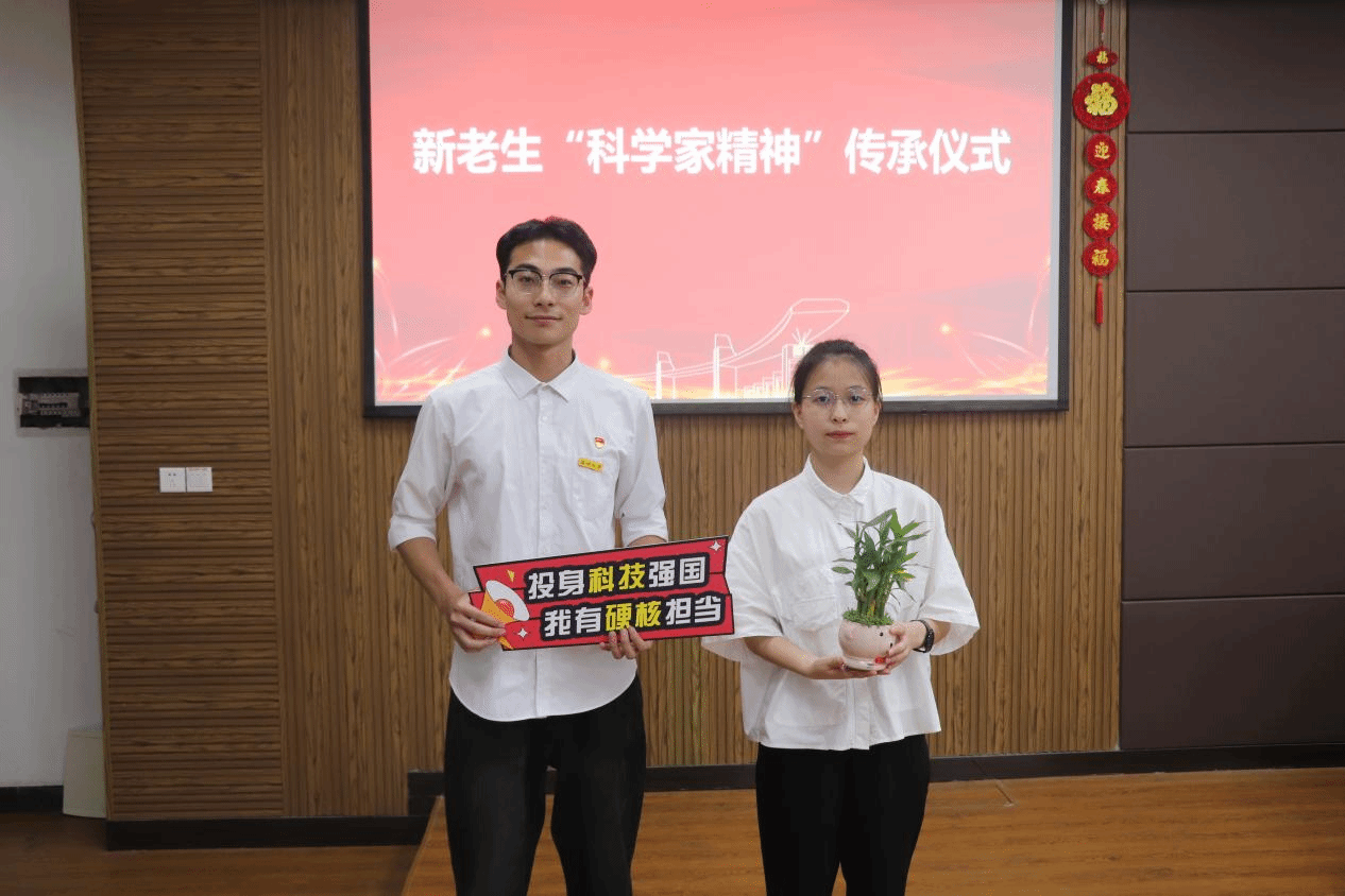 老生代表王秉威将象征“科学家精神”的手牌和节节高植物传递给新生代表陶亚敏,以朋辈引领全体新生用心体悟科学家精神,坚定科技报国信念,以“双一流”自律和“高水平”不断自我鞭策、奋发拼搏!