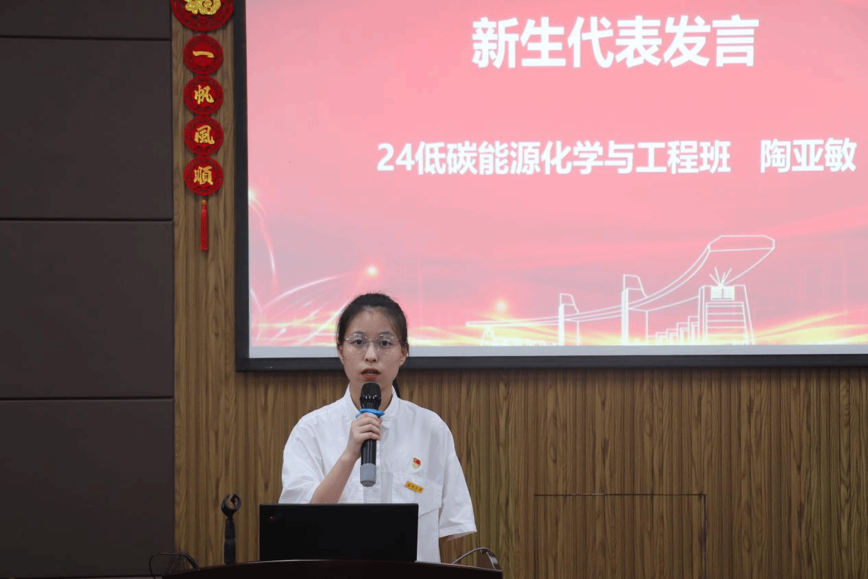 新生代表24低碳能源化学与工程班陶亚敏同学发言。她感恩在温大化材学院度过的本科时光,是学院的整体学术氛围帮助自我不断坚定科研信念、锻炼无畏勇气,敢于挑战未知领域,并积极表态要扎根于学术沃土、接续探索钻研,努力为服务国家战略发展提供可行且高效的解决方案。
