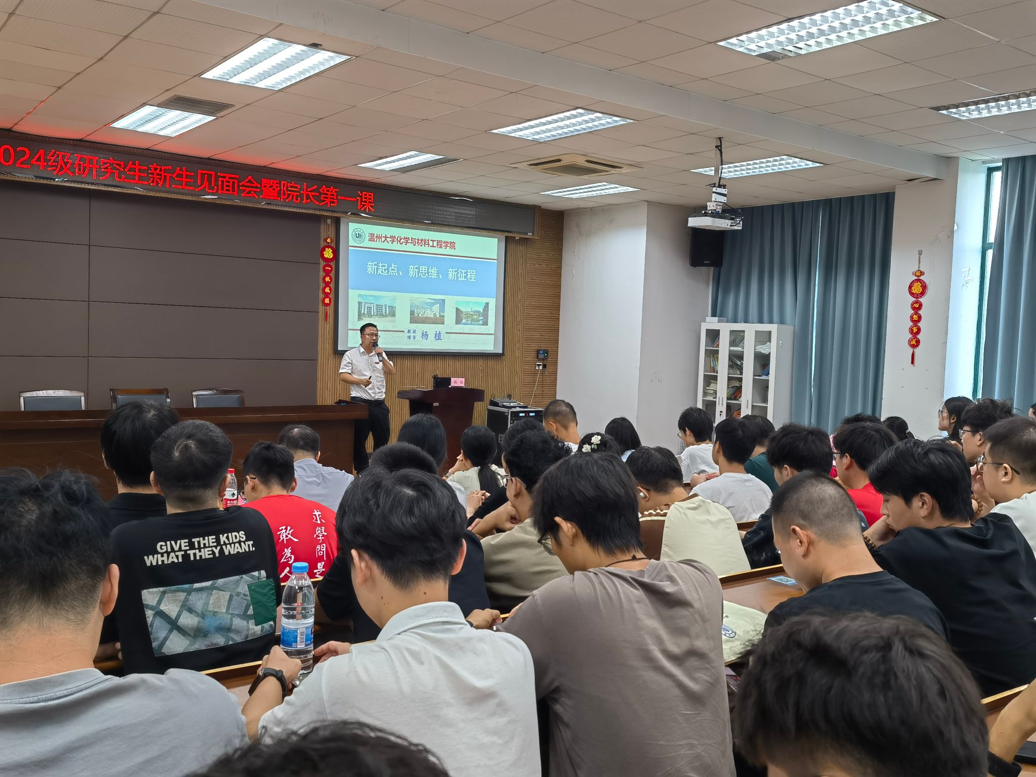 杨植院长为全体研究生新生上院长第一课,他先向265名新生送上最衷心的欢迎和最热烈的祝贺,并为新生导学畅游精妙化学、生动材料世界,引领开启学习研究新篇。他以“新起点、新思维、新征程”为题,生动介绍了温州精神、学院发展历史和学科平台建设情况,引导研究生新生了解化学与材料科学作为基础学科在科技强国建设中的重要地位,激励新生积极响应国家号召,使科研方向与国家战略需求相结合,将“卡脖子”清单变成科研攻关清单,为科技强国建设挺膺担当。并对研究生阶段的科研目标、学习强度、团队协作、压力管理等相关方法进行趣味生动地指导,令24级研究生受益匪浅。