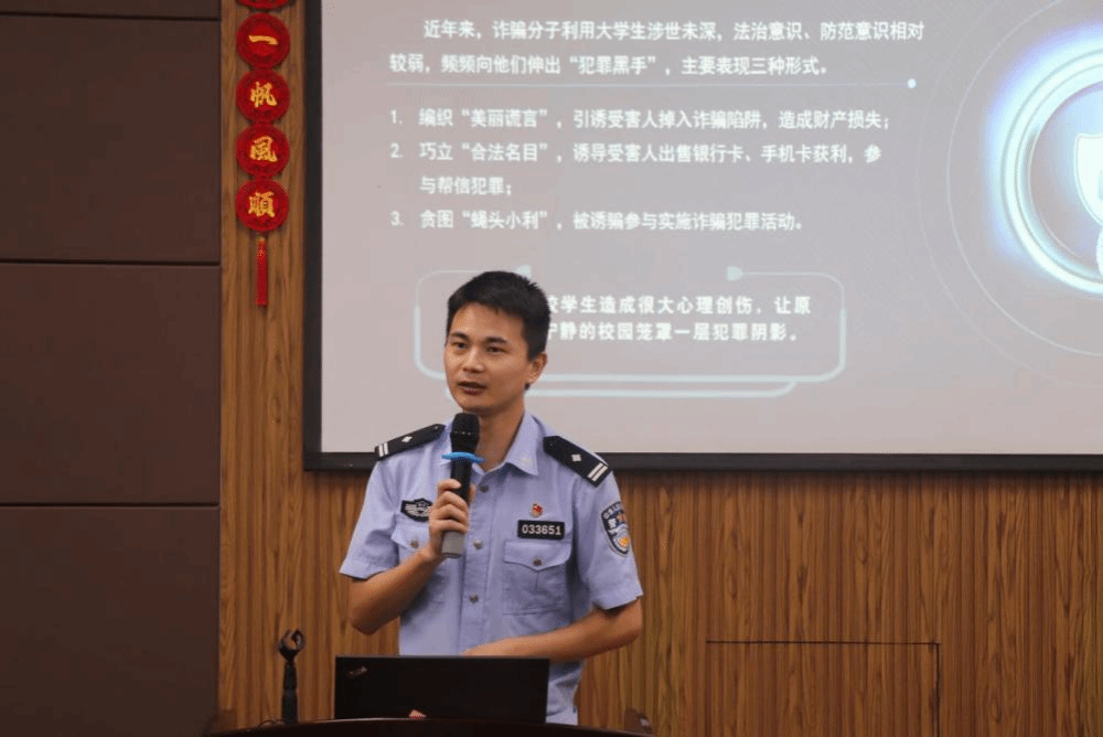 史铁军警长作为心理安全导师代表,为现场300多名学生作题为《身心协同 安全先行》的专题安全形势政策讲座。他从网络诈骗、毒品预防、杜绝邪教、平安出行以及实验室安全五位一体的角度切入,辅以宣教视频以及案例分析,详细讲解了在日常生活中如何防止各类侵害,确保自身安全无虞,为现场的2024级新生注入一剂满满的安全自护强心针。