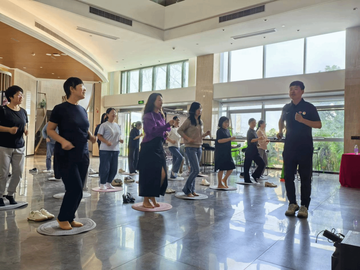 活动开始,李老师向教职工们生动分享超慢跑的概念,运用图片和视频,详细介绍了超慢跑的适用人群、练习方法和特点与优势。在现场演示环节,李老师一对一指导教职工们通过调节呼吸节奏,配合身体、手臂和腿部的姿势,做出科学的超慢跑动作,以达到放松身心、缓解压力、调节情绪的效果。参与的教职工们表示非常高兴参加这样暖心的活动,感慨短短午间一小时意犹未尽,并对后续活动充满期待。