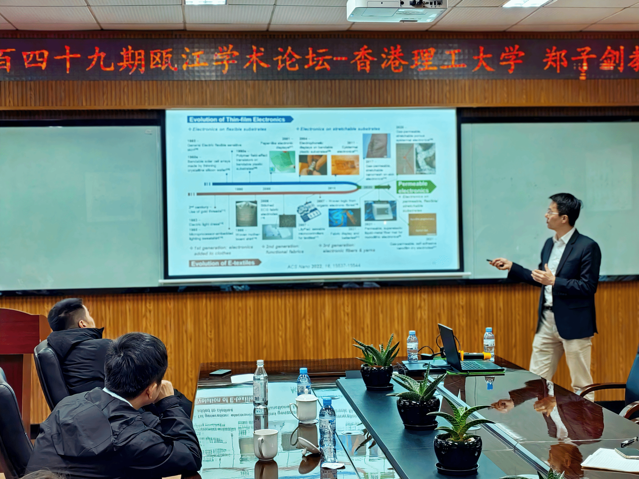 2024年11月29日下午,郑子剑教授做客温州大学化材学院第二百四十九期瓯江学术论坛,在化材学院204会议室为师生们做题为“透气柔性电子”学术讲座。讲座由化材学院的张礼杰副院长主持。