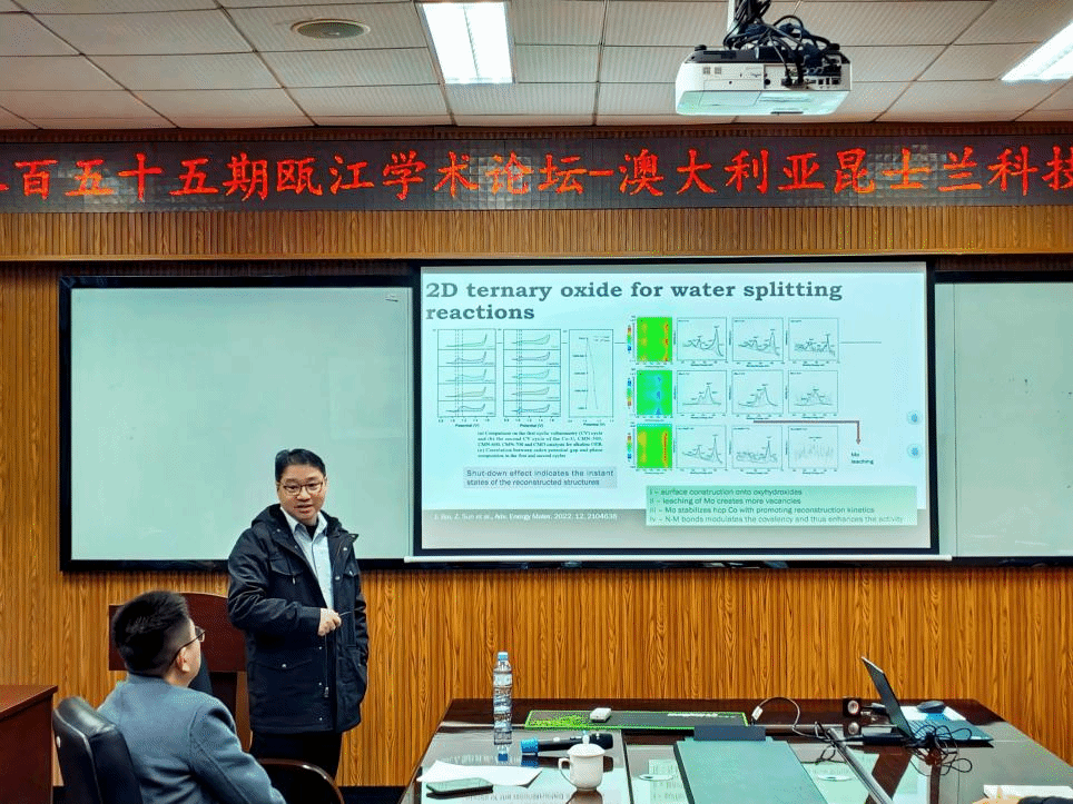 2025年1月15日上午,澳大利亚昆士兰科技大学孙子其教授做客温州大学化材学院第二百五十五期瓯江学术论坛,在化材学院204会议室为师生们做题为“二维金属氧化物在绿色能源中的应用”学术讲座。温州大学副校长王舜及师生代表参加讲座,讲座由化材学院袁一斐教授主持。