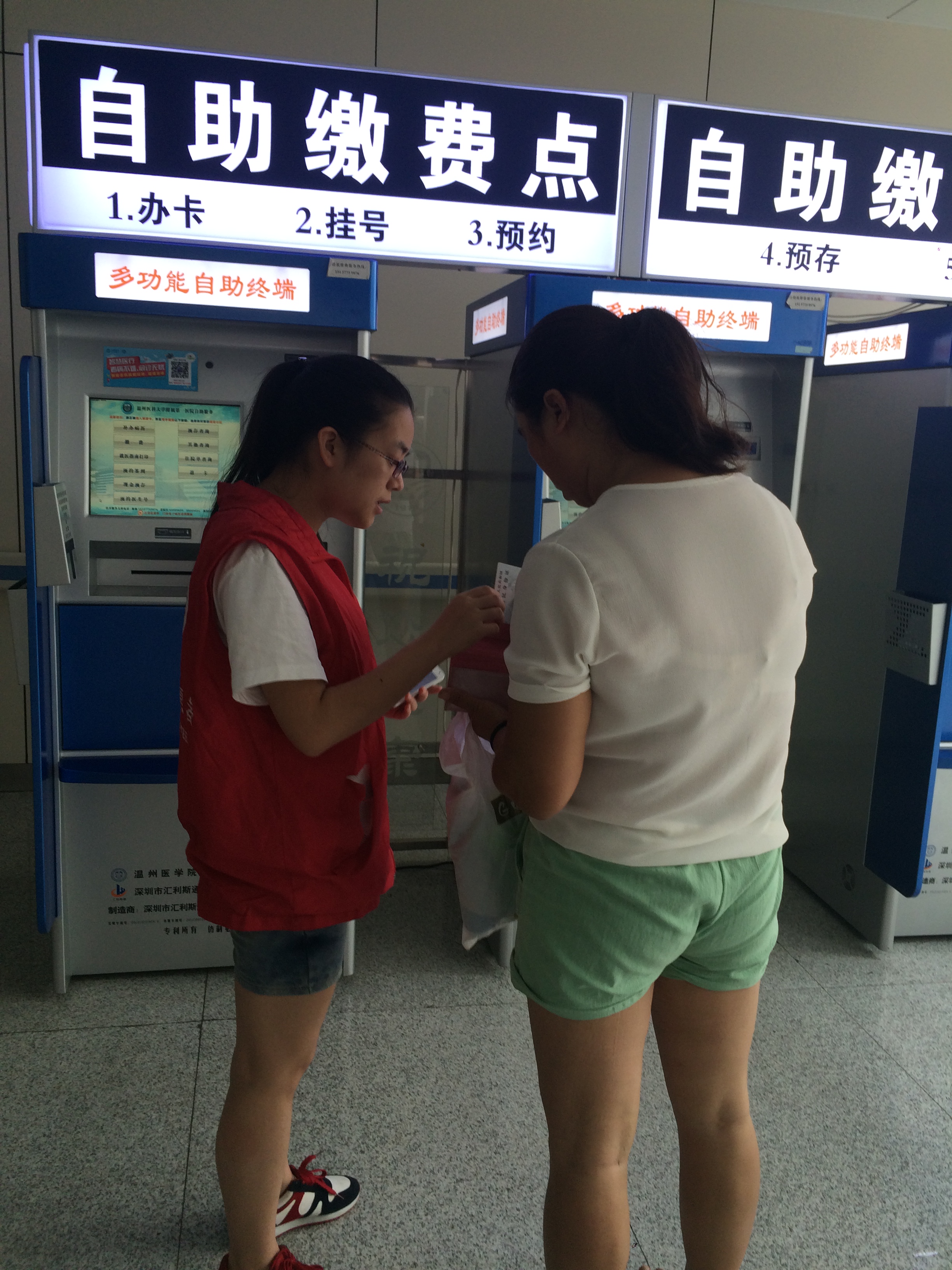 队员共分成两组,分别进行轮椅服务与多功能自助终端的协助工作。与前几日相比较,队员们工作更加地认真努力。对于之前指路难问题,队员们制定了良好的解决方案,并得到了有效的成果。我们将各科室的地点牢记于心,快速有效地解决了病人的疑问。推轮椅的同学也更加活跃,甚至到医院外的马路接送腿脚不便的老人,得到了大家的赞扬与肯定。虽然在医院的实践活动强度很大,每天要走十几公里的路,站立六七个小时,然而队员们的情致却越发激昂,大家都感到非常的充实。