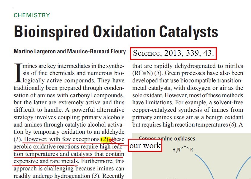 (22) Xiaohui Li, Shuangyan Li, Qiang Li, Xu Dong, Yang Li, Xiaochun Yu, Qing Xu.* Efficient and Practical Catalyst-Free-Like Dehydrative N-Alkylation of Amines and Sulfinamides with Alcohols Initiated by Aerobic Oxidation of Alcohols under Air. Tetrahedron 2016, 72 (2), 264-272 (SCI-III, IF: 2.641). .   (23) Lei Yu,* Yaping Huang, Zheng Wei, Yuanhua Ding, Chenliang Su,* Qing Xu.* Heck Reactions Catalyzed by Ultrasmall and Uniform Pd Nanoparticles Supported on Polyaniline. J. Org. Chem.2015, 80 (17), 8677–8683 (SCI-II,IF: 4.721). 被X-MOL化学咨询平台亮点摘录:  (24) Lei Yu,* Jianqing Ye, Xu Zhang, Yuanhua Ding, Qing Xu.* Recyclable (PhSe)2-catalyzed selective oxidation of isatin by H2O2: a practical and waste-free access to isatoic anhydride under mild and neutral conditions. Catal. Sci. Technol. 2015, 5 (10), 4830-4838 (SCI-II, IF: 5.426).