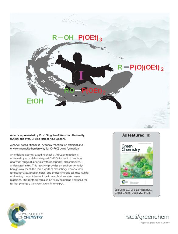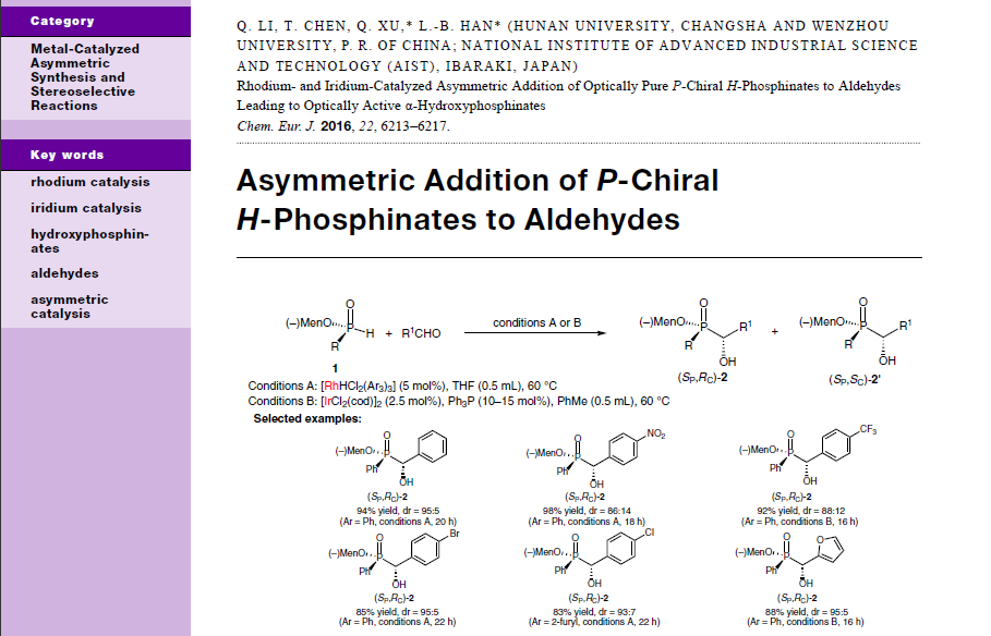 (11) Jianhui Chen,† Yang Li,† Shuangyan Li, Jianping Liu,* Fei Zheng, Zhengping Zhang, and Qing Xu*, Aldehyde/Ketone-Catalyzed Highly Selective Synthesis of 9-Monoalkylated Fluorenes by Dehydrative C-Alkylation with Primary and Secondary Alcohols, Green Chem. 2017, 19 (1), 623-628. (SCI新一区,IF 8.506)  (12) Xiang Ren, Qihang Guo, Jianhui Chen, Hujun Xie,* Qing Xu* and Zhan Lu*. Visible-Light Promoted Distereodivergent Intramolecular Oxyamidation of Alkenes. Chem. Eur. J. 2016, 22 (52), 18695-18699. (SCI-II, IF: 5.731)  (13) Xiaokai Cheng, Bo Yang, Xingen Hu, Qing Xu, and Zhan Lu,* Visible-Light-Promoted Metal-Free Aerobic Oxidation of Primary Amines to Acids and Lactones. Chem. Eur. J. 2016, 22 (49), 17566-17570. (SCI-II, IF: 5.731)  (14) Yang Li, Haonan Chen, Jianping Liu,* Xujun Wan, and Qing Xu*, Clean Synthesis of Primary to Tertiary Carboxamides by CsOH-Catalyzed Aminolysis of Nitriles in Water, Green Chem. 2016, 18 (18), 4865–4870. (SCI-II, IF 8.506) (15)  (16) Wang, Wei-Min; Liu, Li-Juan; Yao, Lan; Meng, Fan-Jie; Sun, Yong-Ming; Zhao, Chang-Qiu; Xu, Qing; Han, Li-Biao. Stereospecific Preparations of P-Stereogenic Phosphonothioates and Phosphonoselenoates. J. Org. Chem. 2016, 81 (15), 6843-6847. (SCI-II,IF: 4.721)  (17) Jianping Liu,* Chao Wang, Xiantao Ma, Xinkang Shi, Xin Wang, Huan Li, and Qing Xu.* Simple Synthesis of Benzazoles by Substrate-Promoted CuI-Catalyzed Aerobic Oxidative Cyclocondensation of o-Thio/Amino/Hydroxyanilines and Amines under Air. Catal. Lett. 2016, 146 (10), 2139-2148 (SCI-III, IF 2.294) DOI: 10.1007/s10562-016-1818-2  (18) Qing Xu,* Huamei Xie, Er-Lei Zhang, Xiantao Ma, Jianhui Chen, Xiao-Chun Yu, and Huan Li. Selective Catalytic Hoffmann N-Alkylation of Poor Nucleophilic Amines and Amides with Catalytic Amounts of Alkyl Halides. Green. Chem. 2016, 18 (14), 3940-3944. (SCI-II, IF: 8.506).  (19) Xiantao Ma, Quan Liu, Xiaojuan Jia, Chenliang Su* and Qing Xu*, Efficient Synthesis of Unsymmetrical Heteroaryl Thioethers and Chalcogenides by Alkali Hydroxide-Mediated SNAr Reactions of Heteroaryl Halides and Dichalcogenides, RSC Adv. 2016, 6 (62), 56930-56935. (IF 3.84).  (20) Xiantao Ma, Chenliang Su, Qing Xu*,  (21) Qiang Li, Tieqiao Chen, Qing Xu,* Li-Biao Han.* Rhodium- and Iridium-Catalyzed Asymmetric Addition of Optically Pure P-Chiral H-Phosphinates to Aldehydes Leading to Optically Active α-Hydroxyphosphinates. Chem. Eur. J. 2016, 22 (18), 6213-6217. (SCI-II, IF: 5.731) Highlighted by Synfacts: