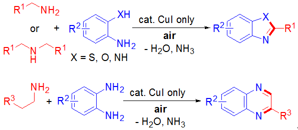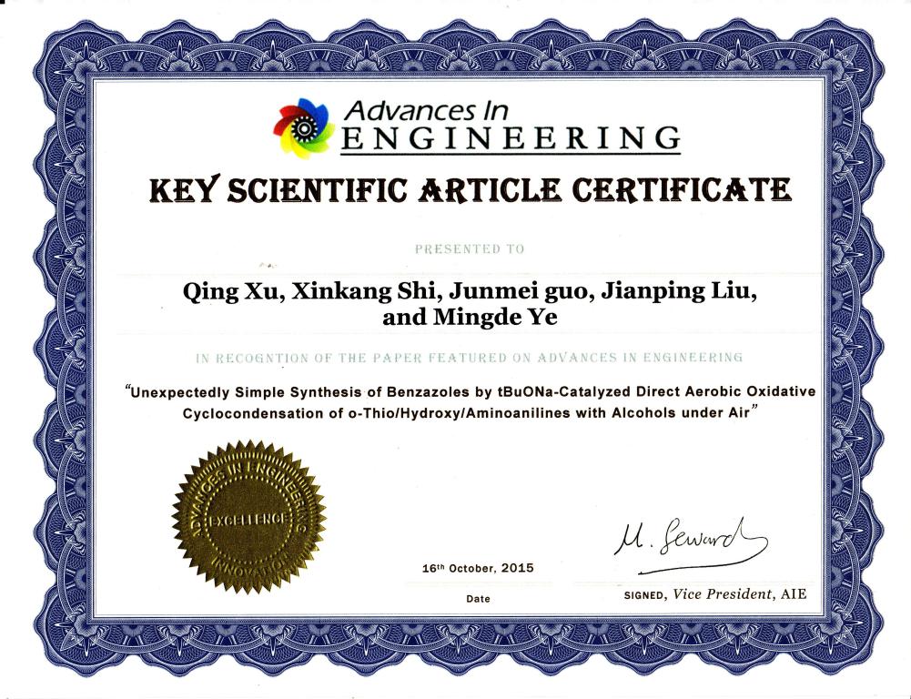 (25) Lei Yu,* Mingxuan Liu, Fenglin Chen and Qing Xu.* Heterocycles from Methylenecyclopropanes, Org. Biomol. Chem. 2015, 13, 8379-8392 (SCI-III, IF: 3.562, 外封面论文). .  (26) Xinkang Shi, Junmei Guo, Jianping Liu, Mingde Ye, Qing Xu.* Unexpectedly Simple Synthesis of Benzazoles by t-BuONa-Catalyzed Direct Aerobic Oxidative Cyclocondensation of o-Thio/Hydroxy/Aminoanilines with Alcohols under Air. Chem. Eur. J. 2015, 21 (28), 9988-9993 (SCI-II, IF: 5.731). Highlighted by Synfacts: Highlighted by as   (27) Shuangyan Li, Xiaohui Li, Qiang Li, Qiaochao Yuan, Xinkang Shi, Qing Xu.* Structure-Dependent Tautomerization Induced Catalyst-Free Autocatalyzed N-Alkylation of Heteroaryl Amines with Alcohols. Green Chem. 2015, 17 (6), 3260-3265 (SCI-II, IF: 8.02).  被X-MOL化学咨询平台亮点摘录:  (29) Xu Zhang, Jianqing Ye, Lei Yu,* Xinkang Shi, Ming Zhang, Qing Xu,* Mark Lautens. Organoselenium-Catalyzed Baeyer-Villiger Oxidation of α,β-Unsaturated Ketones by Hydrogen Peroxide to Access Vinyl Esters. Adv. Synth. Catal. 2015, 357 (5), 955-960 (SCI-II, IF: 5.663). 被Organic Chemistry Portal摘录:  (30) Qiang Li, Yao Huang, Tieqiao Chen, Yongbo Zhou,* Qing Xu, Shuang-Feng Yin,* Li-Biao Han. Copper-Catalyzed Aerobic Oxidative Amination of sp3C–H Bonds: Efficient Synthesis of 2-Hetarylquinazolin-4(3H)-ones. Org. Lett. 2014, 16 (14), 3672–3675 (SCI-II, IF: 6.364).  (31) Lei Yu,* Jun Wang, Hongen Cao, Kehong Ding, Qing Xu*, A Review on Catalyzed Dimerization of Acrylonitrile, Chin. J. Org. Chem. 2014, 37 (7), 1986-1991 (SCI, IF: 0.917).