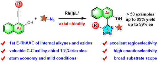 此项工作以《Enantioselective Rh-Catalyzed Azide-Internal-Alkyne Cycloaddition for Construction of Axially Chiral 1,2,3-Triazoles》近期发表在Journal of the American Chemical Society (Pub Date:2022-3-3, DOI:10.1021/jacs.2c01456)上,温州大学作为第一单位,邓超,钱鹏程,李龙为通讯作者。