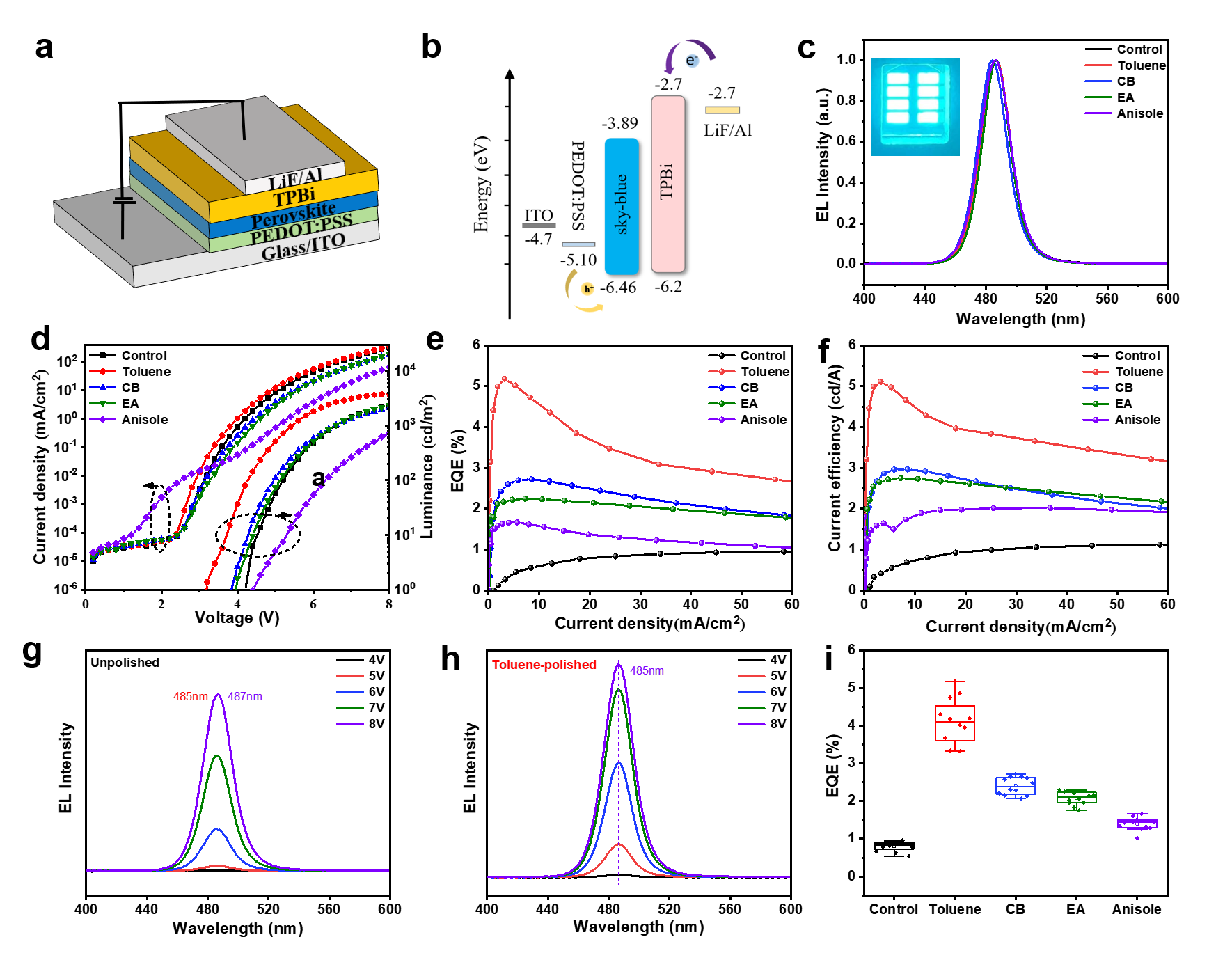 近日,温州大学邹超课题组提出了一种溶剂抛光策略,在不影响载流子输运的前提下有效去除钙钛矿表面的富缺陷层,并有效减少非辐射复合中心n=1相的形成。通过系统研究抛光效果与溶剂极性的关联,确定甲苯溶剂能够在最大限度维持钙钛矿薄膜性质的基础上有效消除缺陷。研究中实现了高效的蓝光PeLED器件,在485 nm处的最大EQE为5.18 %,最高亮度为3737 cd m-2,启亮电压为3.2 V,分别比未抛光的PeLED器件(启亮电压:4.2 V)高出545 %和162 %。这项研究在不损失载流子输运效率的前提下为缺陷消除提供了一种新思路,以实现高效的蓝光PeLED。