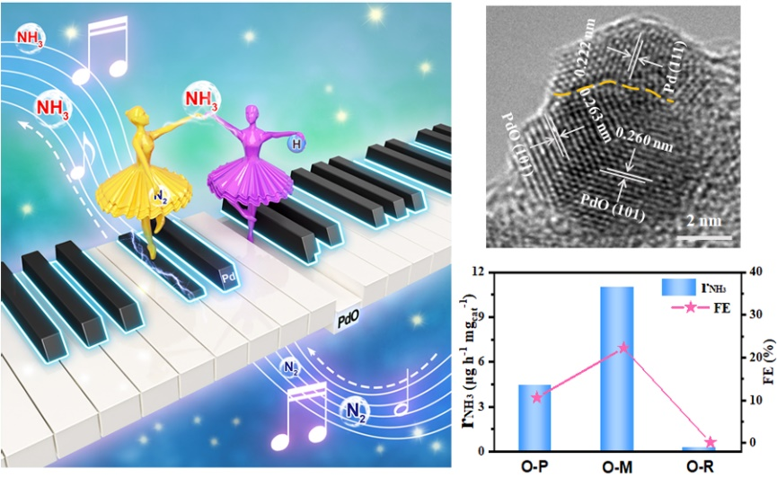 近日,温州大学聂华贵教授和周学梅博士等通过理论计算发现,在纯Pd中引入氧后,能增加氮吸附能,使其锚定在异质结界面的Pd上;H原子吸附在异质结界面的氧上,表现出更高的H吸附能,能够抑制副反应(氢析出)。据此,本研究结合温和的电化学沉积法,制备了一种氧含量可调的Pd/PdO异质结并应用于NRR反应,其展现出优异的催化活性和选择性,即在0.03 V电压下(相对于可逆氢电极),氨气产率和法拉第效率(FE)分别为11.0 μg h−1 mgcat−1和22.2%。为了排除实验中N污染的干扰,本研究运用15N同位素示踪法证明了氨气中N的来源。