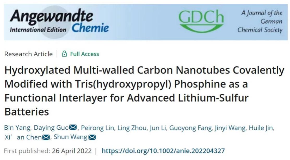 近日,我校陈锡安教授课题组在国际顶级期刊《Angewandte Chemie International Edition》发表题为“Hydroxylated Multi-walled Carbon Nanotubes Covalently Modified with Tris(hydroxypropyl) Phosphine as a Functional Interlayer for Advanced Lithium-Sulfur Batteries”的论文。该工作开发了一种三(羟丙基)膦共价改性羟基化多壁碳纳米管作为先进锂硫电池的功能层。利用三(羟丙基)膦(THPP)作为锂硫电池功能插层中的活性物质,能够快速将液相多硫化锂(Li2Sn, 4≤n≤8)催化转化固相硫化锂(Li2S),从而有效抑制多硫化物穿梭效应。同时能够诱导锂负极表面形成稳定的固体电解液中间相(SEI)层,进而减少锂负极枝晶的形成。并揭示了有机小分子THPP催化多硫化物过程中形成的活性中间体,对锂硫电池中有机小分子催化多硫化物的作用机制提供了一个新的见解。