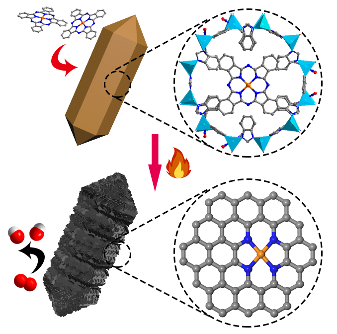 沸石咪唑骨架结构(ZIF)的高孔隙率、可调孔道以及丰富的碳、氮元素等特点,被广泛地用来制备多孔碳材料。由于低沸点Zn基物种在高温下能够快速挥发,Zn-ZIF晶体材料热解煅烧可以形成多孔的氮掺杂碳纳米材料。另一方面,酞菁铁(FePc)为一个18电子共轭体系,它的结构类似于血红蛋白的核心组分,对人体血液中氧气的吸附和运输具有高度选择性,因此被认为是一种有效的氧还原(ORR)催化活性物质。因此,在ZIF晶体材料和FePc客体分子的组合基础上,设计和制备高催化活性和高稳定性的非贵金属ORR电催化剂具有重要意义。