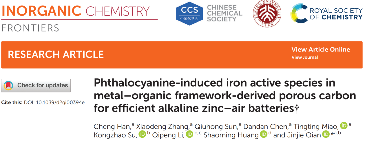 Cheng Han, et al. Phthalocyanine-induced iron active species in metal-organic framework-derived porous carbon for efficient alkaline zinc-air batteries. Inorg. Chem. Front. (2022).