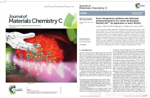 近日,潘跃晓老师指导的研究生席陆青在J. Mater. Chem. C(SCI工程技术一区期刊,影响因子:5.2)上发表题为“Room-temperature synthesis and optimized photoluminescence of a novel red phosphor NaKSnF6:Mn4+ for application in warm WLEDs”的学术文章,并被邀请作为封面文章(Front cover)。该学生在温大攻读硕士学位3年间,刻苦学习,品学兼优,已分别获得了以下科研成果与奖项。
