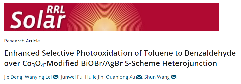 近日,我校徐全龙副教授在国际期刊《Solar RRL》发表了题为”Enhanced Selective Photooxidation of Toluene to Benzaldehyde over Co3O4-Modified BiOBr/AgBr S-Scheme Heterojunction”的论文。在这项工作中,Co3O4修饰的BiOBr/AgBr S型异质结可以有效地将苄基位的sp3 C-H键氧化成相应的醛,苯甲醛的选择性达到94%,远高于纯BiOBr (21.7%)和AgBr (58.9%)。通过 X 射线光电子能谱和活性物质猝灭实验,证实了三元复合材料的S型电荷迁移机制。保留在AgBr导带中的具有强还原能力的光生电子可以与O2反应生成•O2−活性物质,其可进一步将Co3O4表面形成的苄基自由基氧化为过氧自由基,然后热力学分解为苯甲醛。该工作对光催化剂的结构调控及其在烃类sp3 C-H键选择性氧化中的应用具有重要的指导意义。