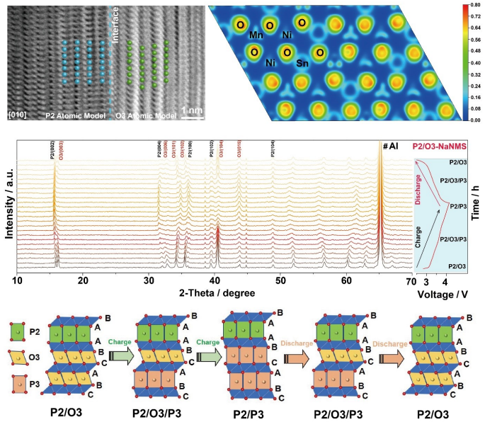 图1. P2/O3-NaNMS异质结构正极材料的原子结构表征,理论计算以及充放电过程中晶体结构演变示意图