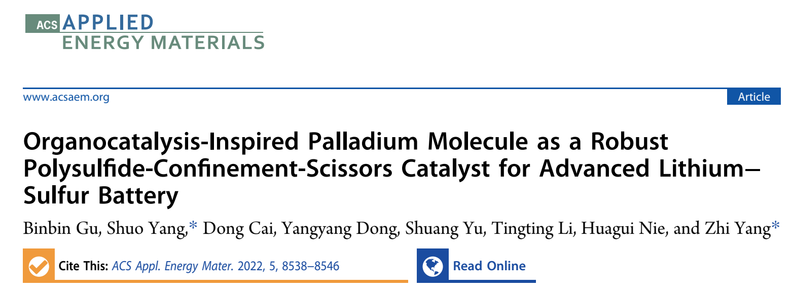 相关研究成果以《Organocatalysis-Inspired Palladium Molecule as a Robust Polysulfide-Confinement-Scissors Catalyst for Advanced Lithium–Sulfur Battery》为题发表在《ACS Applied Energy Materials》杂志上(//doi.org/10.1021/acsaem.2c01078)。杨植教授、青年教师杨硕博士为通讯作者,我院硕士研究生谷斌斌为第一作者,聂华贵教授、蔡冬博士、研究生东洋洋、于爽、李婷婷等人参与此项工作。相关工作受到国家自然科学基金项目(22109119, 51972238, 22105147,21875166),浙江省自然科学基金项目(LR18E020001,LQ22B030003),温州市重大科技创新攻关项目(ZG2021013)以及温州市一般科研项目(G2020002,H20210006)的支持。