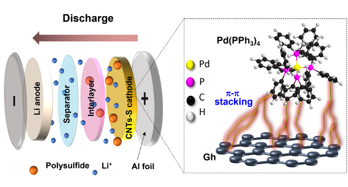 有机金属钯分子因在众多工业合成中都表现出超高的催化活性,从而引起了人们的注意。近期我院杨植教授团队开发了一种四(三苯基膦)钯(TPP)催化剂修饰石墨烯(Gh)的插层膜,应用于Li−S电池正极结构中。结合原位光谱、电化学表征和理论计算研究发现,在Li−S电池体系中,三苯基膦的解离打开了TPP 的盖子,为吸附/催化长链和短链多硫化锂提供了足够的空间和催化活性位点。此外,TPP中存在大量亲锂的P原子,可通过P−Li键促进Li+的传输。由于这种协同效应,含有Gh/TPP的锂硫正极在4.43 mg cm−2的高硫负载条件下,仍显示出优异的循环稳定性(在0.1 C下循环180 圈容量保持率为83.7%,面积容量为2.44 mAh cm−2)。这项工作架起了有机催化和电化学之间的桥梁。