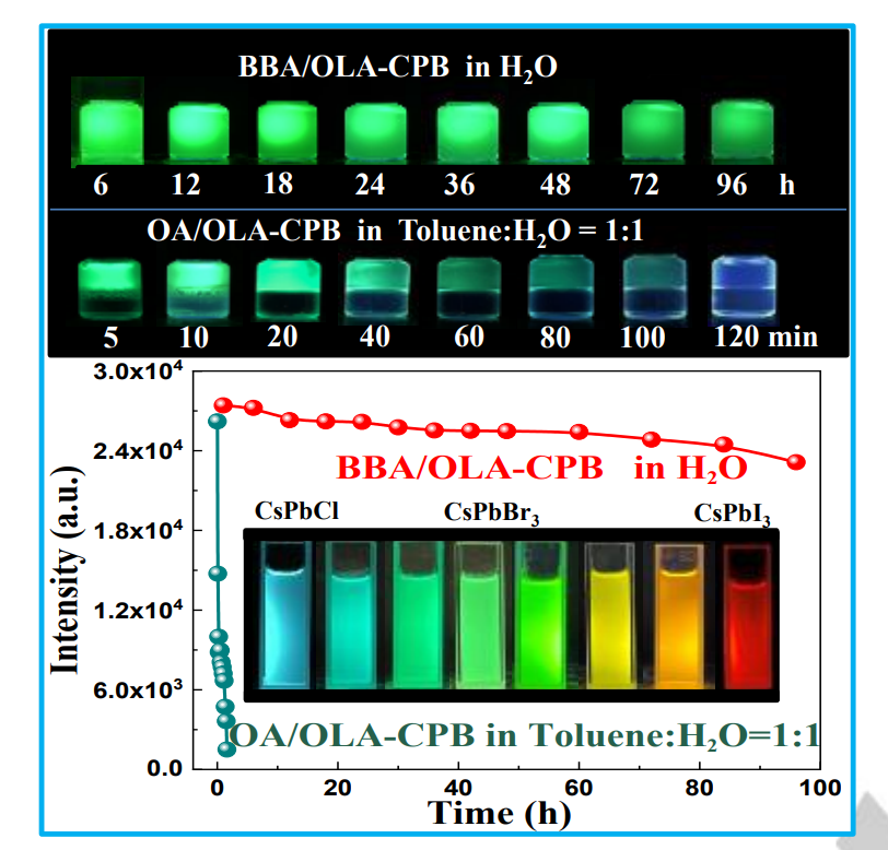 本文研究为设计合成稳定性较高的、能够在极性溶剂中具有稳定性的全无机钙钛矿量子点提供机会,展示了界面化学的前景和发展方向。