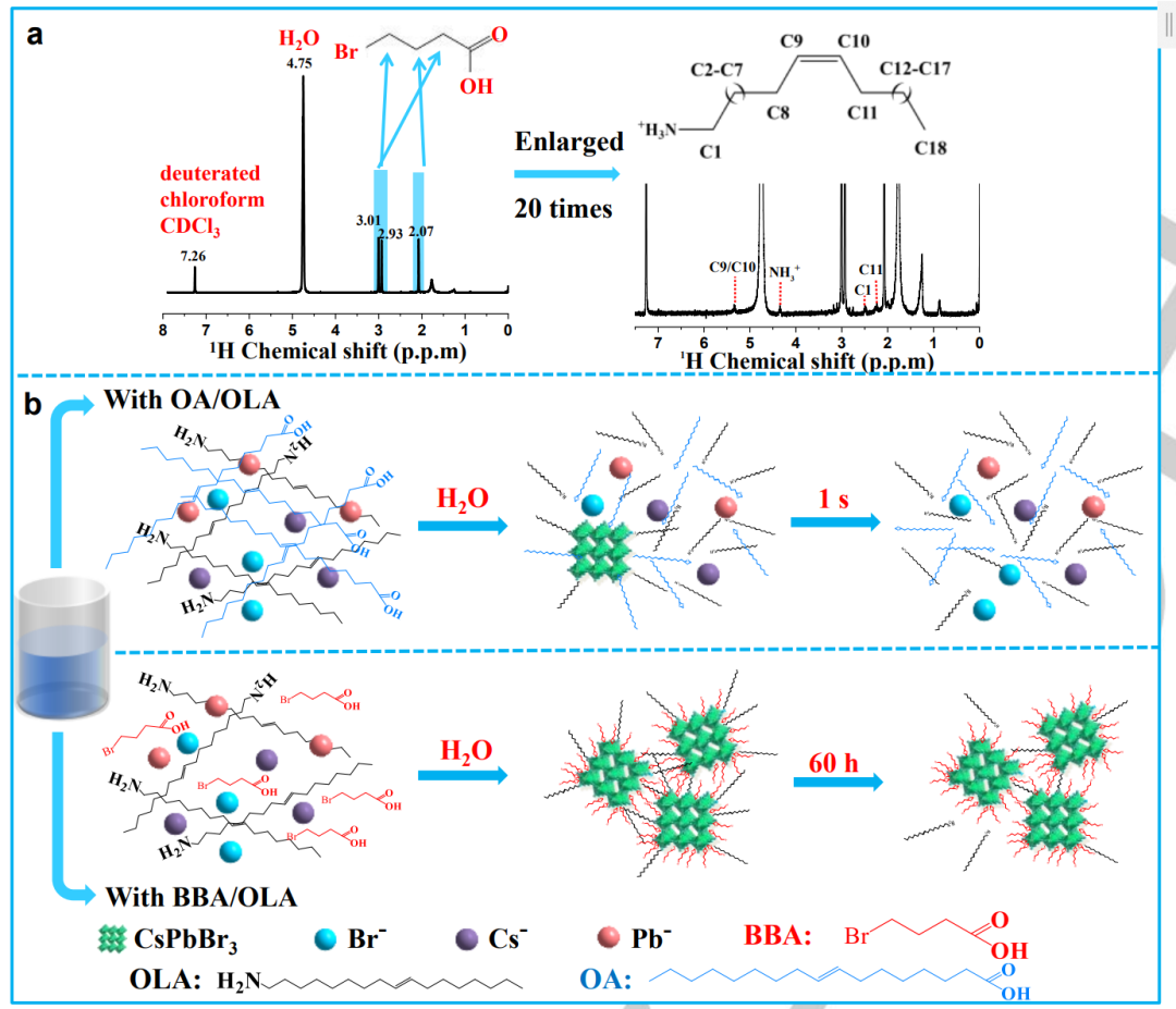 温州大学潘跃晓、中科院长春应化所林君等人报道发展了一种简单有效的原位晶化方法能够显著改善钙钛矿量子点的稳定性,通过在含有水的极性溶剂通过4-溴丁酸(BBA)和油胺(OLA)的协同作用实现提高钙钛矿量子点在溶液中的稳定性。