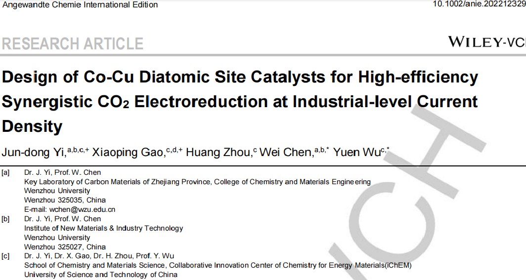 近日,我院陈伟教授和中国科学技术大学吴宇恩教授课题组合作在国际顶级期刊《Angewandte Chemie International Edition》发表题为“Design of Co-Cu Diatomic Site Catalysts for High-efficiency Synergistic CO2 Electroreduction at Industrial-level Current Density”的论文。该工作设计合成了一种新型CoCu双原子催化剂,实现了在大电流下将CO2高效电化学转化为CO。