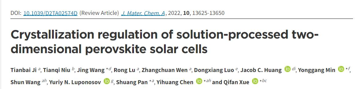 近日,温州大学王舜教授课题组和华南理工大学薛启帆教授团队从二维钙钛矿的结构和结晶动力学角度出发,总结了二维钙钛矿太阳能电池的优化手段和研究进展。主要内容包括二维钙钛矿的结构特征、钙钛矿太阳能电池的结晶机制、优化二维钙钛矿结晶的策略,如制备工艺、前驱体组分的调控、形貌调控、添加剂策略等方面。着重分析和讨论了二维钙钛矿成长成核的内在机理、结晶条件以及取向对太阳能器件的影响。尽管二维钙钛矿优异的表面疏水性和空间位阻有效缓解了环境稳定性的问题,但其较低的器件效率仍然阻碍钙钛矿太阳能电池商业化进程。对于二维钙钛矿太阳能电池,良好的表面形貌、合理的相组成和分布以及垂直的晶体取向是确保载流子有效传输并获得高光电转换效率的重要因素。作者通过系统的研究二维钙钛矿组成、溶剂、沉积方法和制备工艺对器件结晶成核过程的影响,对制备高质量高效率的二维钙钛矿太阳能电池提出了独到的见解。最后,作者对二维钙钛矿目前存在的问题和未来发展前景提出建议和畅想,并肯定了二维钙钛矿材料在太阳能电池领域的出色表现。对二维钙钛矿材料彻底了解、深入研究钙钛矿的结晶机理,尤其是它们在不同器件中的普适原理、了解结晶控制手段和结构优化设计的相关理论,将推动二维钙钛矿太阳能电池走向商业化,展现更广阔的应用空间。