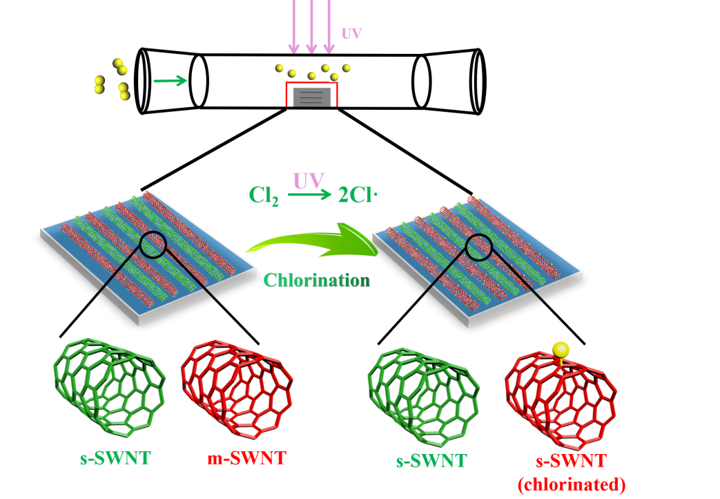 为解决上述问题,温州大学胡悦特聘教授团队联合广东工业大学黄少铭教授与吉林大学赵秋辰教授,提出了一种光氯化法制备半导体单壁材料碳纳米管及其分子内结。如图1所示,氯气在紫外线照射下分解得到氯自由基,可选择性地与金属性单壁碳纳米管共价结合,打开其带隙使其转变为半导体性单壁碳纳米管,最终使得整个单壁碳纳米管水平阵列呈现半导体性并在室温条件下可长期保持稳定性。