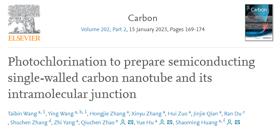 这一成果近期以“Photochlorination to prepare semiconducting single-walled carbon nanotube and its intramolecular junction”为题发表在国际期刊《Carbon》上,温州大学为第一通讯单位,温州大学化学与材料工程学院研究生汪泰滨和王赢为文章的第一作者,我校胡悦特聘教授、广东工业大学黄少铭教授、吉林大学赵秋辰教授为通讯作者。