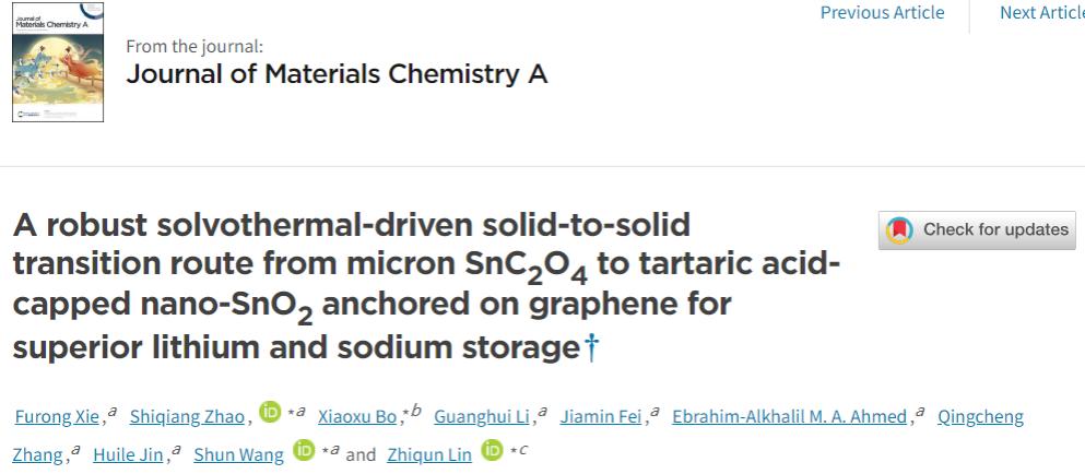 近日,国际能源期刊《Journal of Materials Chemistry A》在线刊登了我院赵世强副教授指导的研究论文“A Robust Solvothermal-Driven Solid-to-Solid Transition Route from Micron SnC2O4 to Tartaric Acid-Capped Nano SnO2 Anchored on Graphene for Superior Lithium and Sodium Storage”。