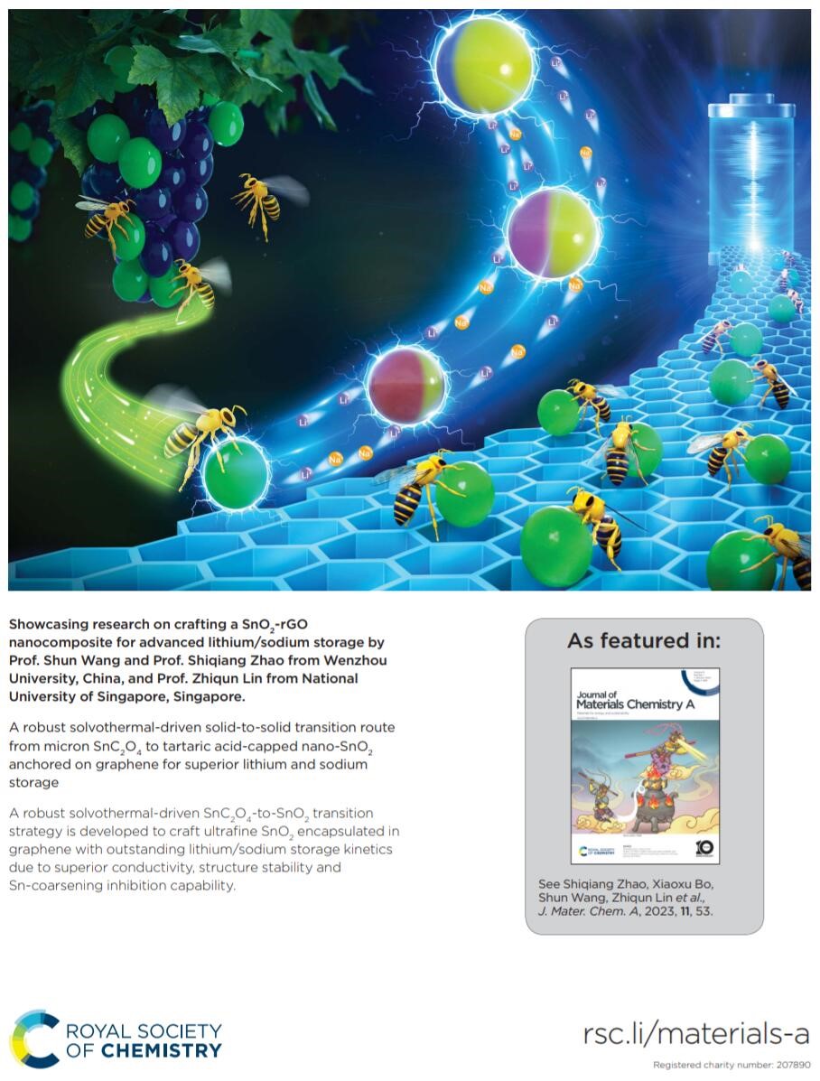 近日,国际能源期刊《Journal of Materials Chemistry A》将我院王舜教授、赵世强副教授指导的研究论文“A Robust Solvothermal-Driven Solid-to-Solid Transition Route from Micron SnC2O4 to Tartaric Acid-Capped Nano SnO2 Anchored on Graphene for Superior Lithium and Sodium Storage”选为期刊封面文章。