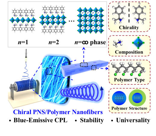 手性钙钛矿通常在低温下才能实现圆偏振发光,目前具有室温下圆偏振发光性能的钙钛矿相关研究还在起步阶段。针对上述现状,近日温州大学化学与材料工程学院王舜/潘霜/陈亦皇课题组提出了一种通过一步静电纺丝法,原位合成聚合物纳米纤维保护的手性二维/准二维钙钛矿有机无机复合功能纳米材料,以实现室温下高效蓝色圆偏振发光。