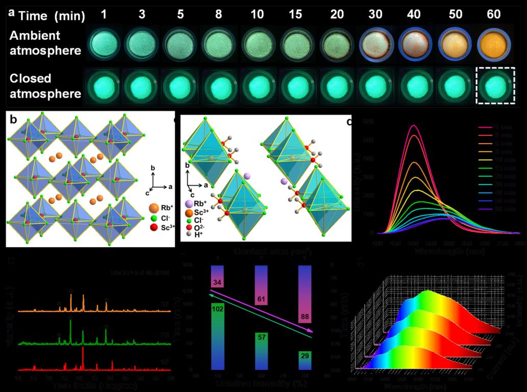 此外,在普通的室内环境下,经过1小时后,裸露在空气中的青色发光的Rb3ScCl6:Sb3+会水分而改变其晶体结构,变回橙色发光的Rb2ScCl5·H2O:Sb3+,其转变速率与接触面积和空气湿度存在强烈的正相关性,并且可以多次循环使用,对比发现,在密封的Rb3ScCl6:Sb3+因为隔绝了空气,经过1小时后,依然保持明亮的青色发光。