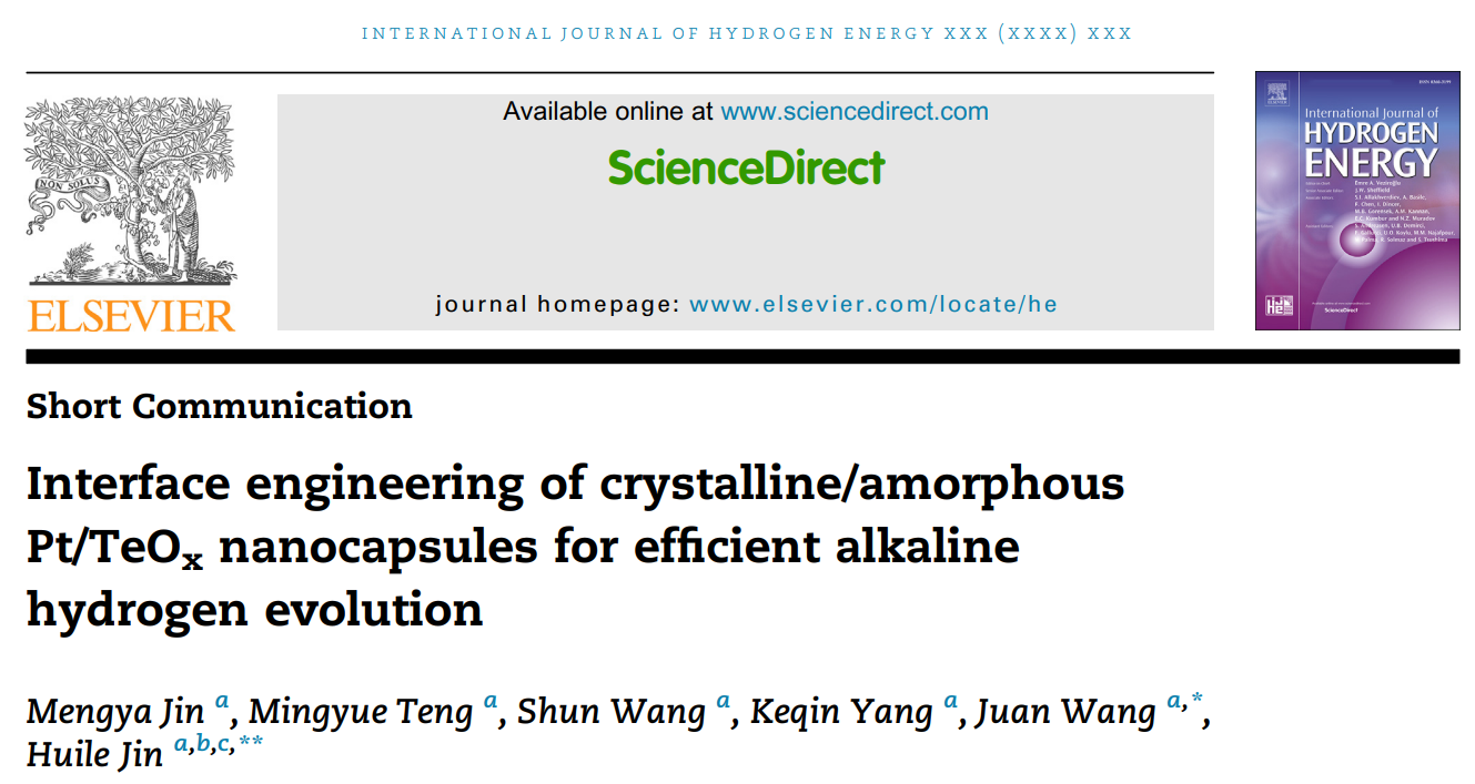 相关研究以“Interface engineering of crystalline/amorphous Pt/TeOx nanocapsules for efficient alkaline hydrogen evolution”为题发表在国际期刊《International Journal of Hydrogen Energy》(JCR-2区, IF=7.139)上,温州大学作为唯一通讯单位,我院2019级本科生金梦雅为第一作者,我院金辉乐教授、王娟副教授为本文通讯作者。该工作得到王舜教授、杨克勤老师等的协助,并受到国家自然科学基金(No. (51872209和22105146)、浙江省高层次人才专项支持计划(2019R52042)与浙江省新苗人才计划(2022R429A019)等项目的支持。