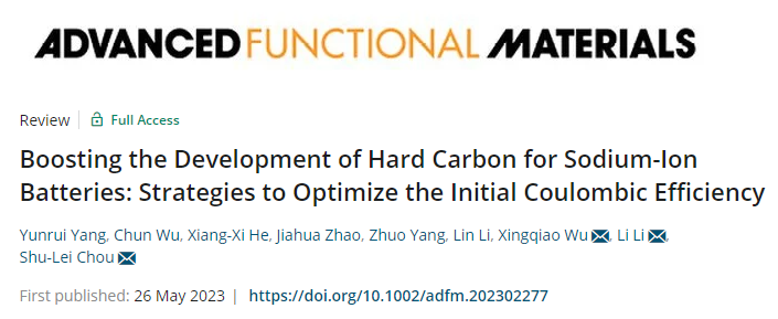 该论文以“Boosting the Development of Hard Carbon for Sodium-Ion Batteries: Strategies to Optimize the Initial Coulombic Efficiency”为题发表在国际权威期刊《Advanced Functional Materials》上,第一作者为我院2021级硕士研究生杨云锐以及长沙理工大学吴春博士。温州大学为第一通讯单位,我院侴术雷教授、吴星樵博士以及上海大学李丽副教授为该论文共同通讯作者,相关工作受到国家自然科学基金、浙江省自然科学基金、温州市自然科学基金、温州大学硕士研究生创新基金和国家电网公司科技项目的资助。