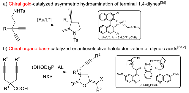 二炔的去对称化反应在以往的报道中大都依赖于过渡金属催化剂,催化模式较为单一,而有机碱催化的策略需要额外当量的卤化试剂作为亲电试剂用于活化炔基同时提供手性控制位点,这大大限制了这类反应的应用范围。因此,如何在温和条件且无需额外试剂的情况下实现有机小分子催化二炔的去对称化反应成为了难题。