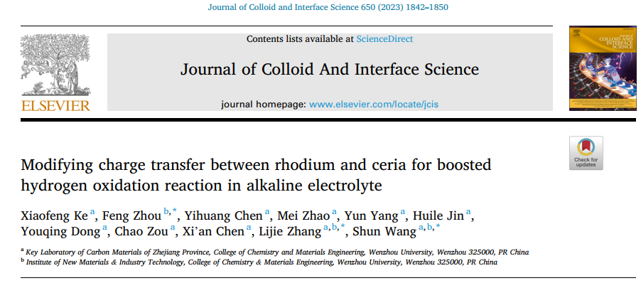 这项研究的成果《Modifying charge transfer between rhodium and ceria for boosted hydrogen oxidation reaction in alkaline electrolyte》发表在《Journal of Colloid and Interface Science》(中科院1区,Top,IF = 9.9)上,温州大学为第一通讯单位,我院2020级研究生柯小凤为第一作者,张礼杰研究员为通讯作者、王舜教授、周峰博士为共同通讯作者。该研究得到了国家自然科学基金(52072272、52171145和22109120)、浙江省自然科学基金(LQ21B030002)、浙江省高层次人才专项支持计划(2019R52042)和温州市科技创新重点项目(ZG2022037)的支持。