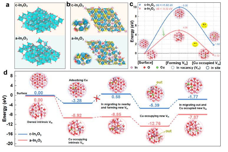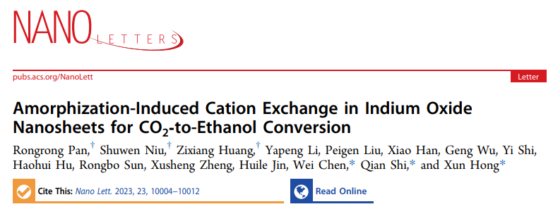 我院陈伟、时茜教授课题组和中国科学技术大学洪勋教授课题组在国际知名期刊《Nano Letters》发表题为“Amorphization-induced cation exchange in indium oxide nanosheets for CO2-to-ethanol conversion”的论文。该工作在理论计算的指导下,以无定形In2O3纳米片(a-In2O3 NSs)为主体材料,在室温下与多种客体阳离子进行CE反应。密度泛函理论(DFT)计算表明,无定形纳米材料中丰富的配位-不饱和金属位点对于突破CE反应的能垒以调控金属氧化物的组成至关重要。