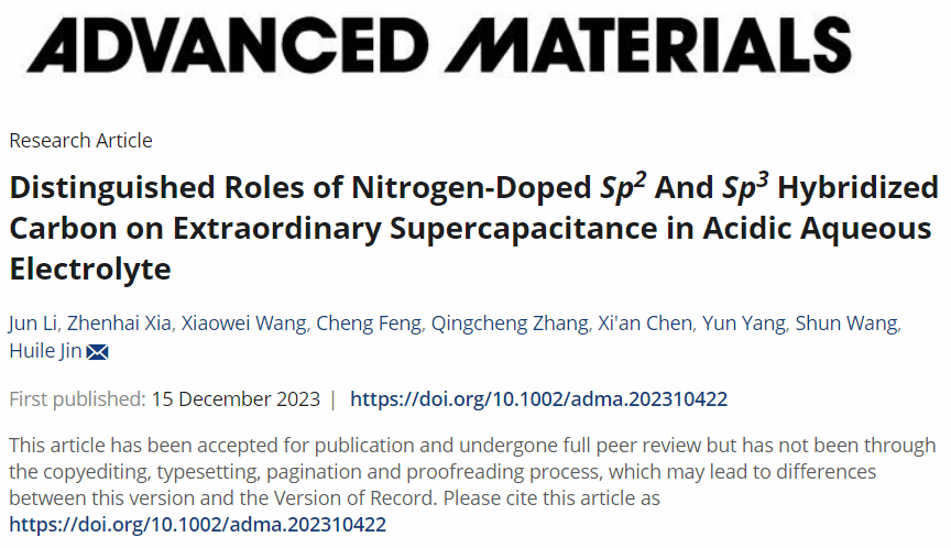 Distinguished Roles of Nitrogen-Doped sp2 and sp3 Hybridized Carbon on Extraordinary Supercapacitance in Acidic Aqueous Electrolyte, Advanced Materials, 2023, doi: 10.1002/adma.202310422
