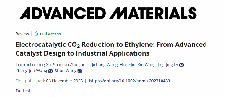 该综述以“Electrocatalytic CO2 Reduction to Ethylene: From Advanced Catalyst Design to Industrial Applications”为题发表在国际顶级期刊⟪Advanced Materials⟫期刊上。温州大学为第一通讯单位,我院2021级硕士生陆天睿、温州大学博士后徐婷为共同第一作者,我院吕晶晶教授、王正军博士、王舜教授为共同通讯作者。