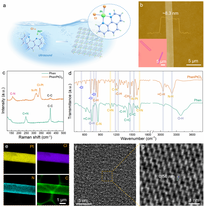 氢能是一种理想的清洁新能源,具有多用途、高能量密度和零排放等优点。电催化析氢反应(HER)作为一个重要的电化学过程,对绿色制氢和燃料电池技术发展具有深远的影响。铂基催化剂虽然在HER中表现出了优异的性能,但其高昂的成本和有限的可用性阻碍了其广泛应用。因此,人们迫切需要研究可替代的、具有经济效益的催化剂,这些催化剂能够匹配甚至优于商用Pt/C催化剂的性能。近年来,二维(2D)材料由于其独特的性质、高表面积和可调谐的电子/原子结构,作为Pt基催化剂的潜在替代品而引起了人们的关注。尽管二维材料具有非常大的潜力,但在理解其结构与电催化性能之间的复杂关系方面仍然存在挑战。其中,2D PhenPtCl2纳米片是由PhenPtCl2分子缩合而成的分子晶体,具有不对称配位Pt与两个Cl离子和菲罗啉(Phen)形成双齿配体结构。值得注意的是,Pt作为活性中心的催化性能可以通过配体进行精细调节。Cl的存在为二维PhenPtCl2纳米片的配位结构提供了无与伦比的调控水平,允许动态控制Pt的配位数。这种配位结构的灵活性,加上动态配位的便利性,使得先进的表征技术能够在不同阶段评估其催化性能。