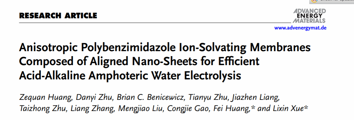文章链接:“Anisotropic Polybenzimidazole Ion-Solvating Membranes Composed of Aligned Nano-Sheets for Efficient Acid-Alkaline Amphoteric Water Electrolysis”