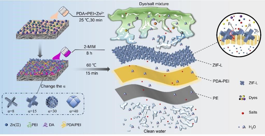 图1. PDA-PEI涂层中ZIF-L阵列的原位形成及其分离效果示意图。