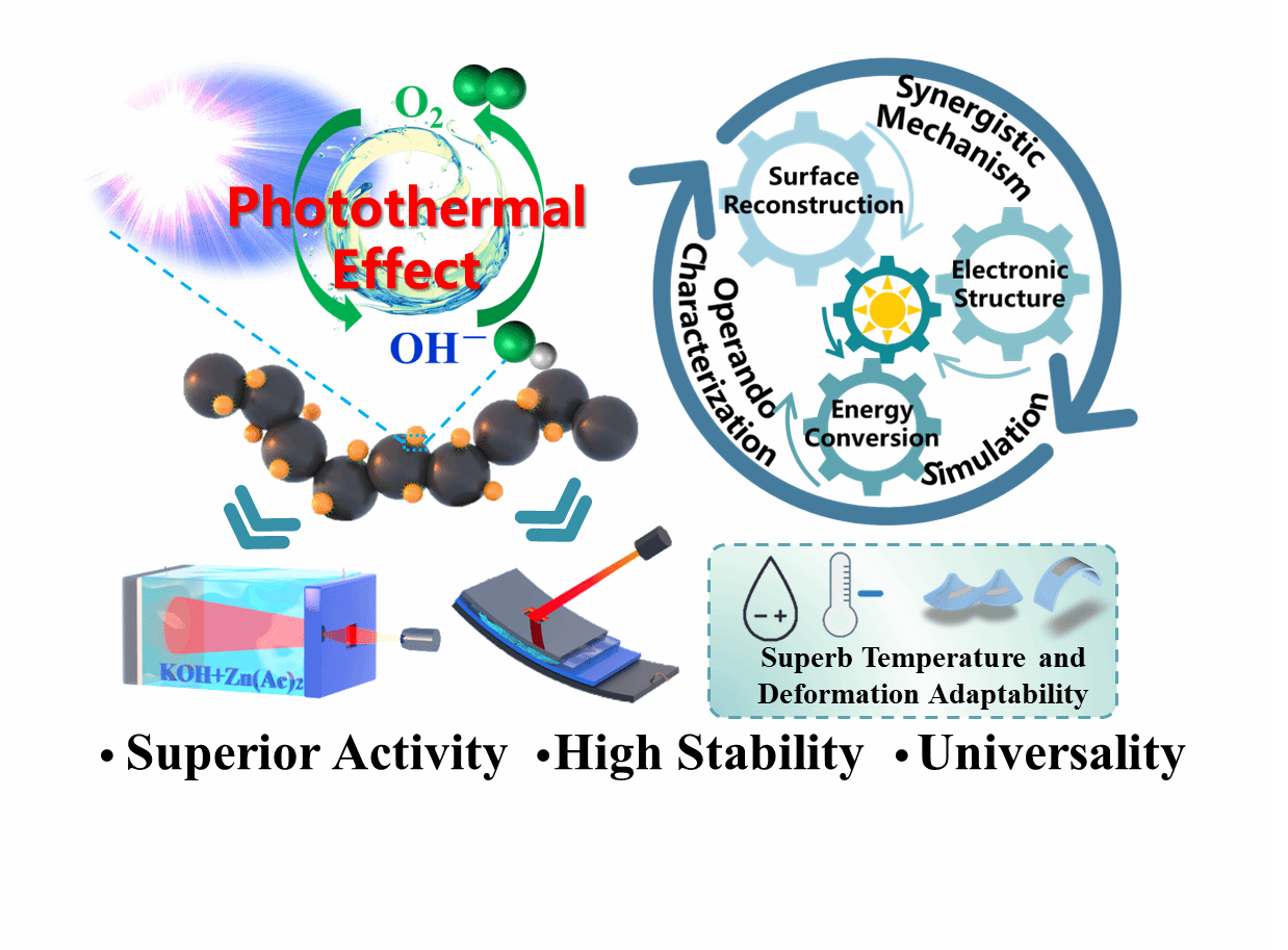 这项研究强调了外场响应式三元电催化剂的实现和机理。具体而言,通过聚合物辅助方法制备了稳定的 Ni0.5Mn0.5Fe2O4/N-KB (图一),表现出令人信服的光热效应,可实现工作电极的瞬间和局部加热,从而避免了以往无法避免的不良副反应和能量浪费。通过光热效应,电催化活性得到提高,ΔE 仅有0.618 V。令人鼓舞的是,Ni0.5Mn0.5Fe2O4/N-KB 的可充电液相 ZABs的峰值功率密度高达 319 mW cm-2,并能在10-100 mA cm-2电流密度下可稳定循环。此外,光热促进的柔性 ZAB在不同的工作条件下(尤其是变形和低温条件下)都能提供全面的优异性能。DFT 和原位拉曼研究进一步揭示了潜在机理。总之,这项研究中外场促进电催化的深刻见解为设计和利用各种领域的高性能催化剂开辟了一条诱人的途径。