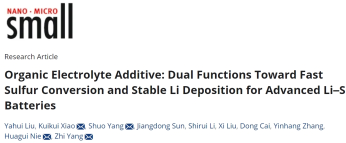 该研究以“Organic Electrolyte Additive: Dual Functions toward Fast Sulfur Conversion and Stable Li Deposition for Advanced Li–S Batteries”为题发表在国际顶级学术期刊《Small》。温州大学为唯一通讯单位,我校肖逵逵博士,杨硕副教授,聂华贵教授和杨植教授为共同通讯作者,化材学院21级硕士研究生刘雅慧为第一作者,相关工作受到国家自然科学基金(22309135、22109119、51972238、U21A2081)、浙江省自然科学基金(LQ22B030003)、温州市重大科技创新项目(ZG2021013)等项目的资助。