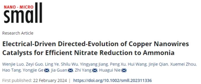 相关研究成果以《Electrical-Driven Directed-Evolution of Copper Nanowires Catalysts for Efficient Nitrate Reduction to Ammonia》为题发表在国际著名期刊《Small》(IF:13.3)上。温州大学2020级研究生罗文杰和2022级研究生郭泽佚为第一作者,我院杨植教授、聂华贵教授、葛勇杰副研究员和贯佳副教授为共同通讯作者。