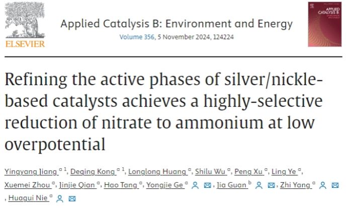 相关研究成果以《Refining the Active Phases of Silver/Nickle-based Catalysts Achieves a Highly-Selective Reduction of Nitrate to Ammonium at Low Overpotential》为题发表在《Applied Catalysis B-Environmental》(IF:22.1)上。温州大学2021级研究生江颍洋和2022级研究生孔德清为第一作者,我院杨植教授、聂华贵教授、葛勇杰副研究员和贯佳副教授为共同通讯作者。