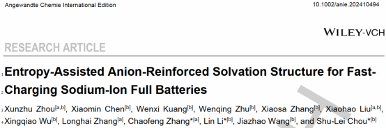 近日,我院碳中和技术创新研究院李林团队联合安徽大学张朝峰在国际权威期刊Angew. Chem. Int. Ed.上发表题为《Entropy-Assisted Anion-Reinforced Solvation Structure for Fast-Charging Sodium-Ion Full Batteries》的学术论文。本文提出了一种具有阴离子增强型溶剂化结构和高离子电导率的混合酯醚电解液,诱导阴离子衍生的坚固电极-电解液界面的形成。将弱溶剂化的醚基溶剂四氢呋喃(THF)引入到碳酸丙烯酯(PC)基电解液中,记为1.0 M NaPF6-PC/THF,调节更多的PF6-阴离子参与到Na+内鞘中,加速脱溶过程。此外,由熵效应引起的分子多样性增加的弱溶剂化结构可以增强离子电导率和快速的界面动力学。18650圆柱PB||HC全电池在100次循环后容量保持率为82.5%。这项工作强调了熵辅助的混合酯醚电解液在高性能钠离子电池中的潜力。人妻NTR相关的文章发表在Angew. Chem. Int. Ed.上,我院侴术雷教授、李林特聘教授以及安徽大学张朝峰为该论文共同通讯作者,相关工作受到国家自然科学基金、安徽省自然科学基金、浙江省自然科学基金、国家电网科技计划等项目的支持。