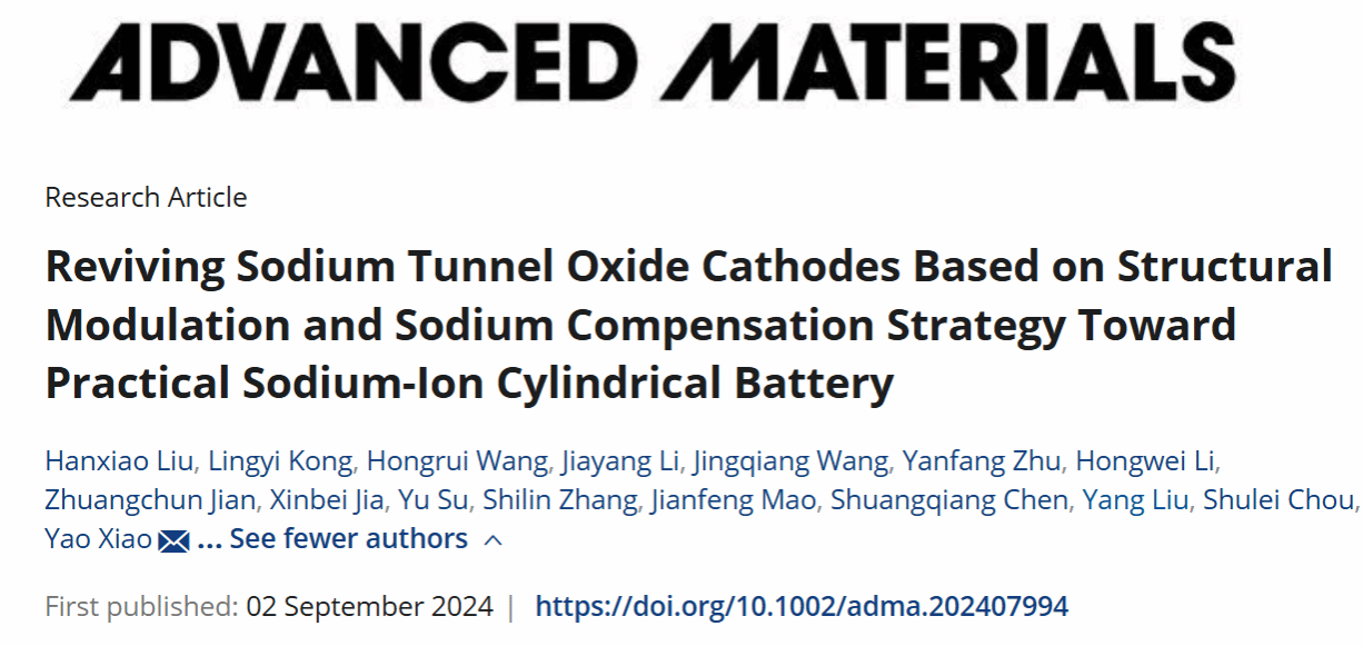 该成果以“Reviving Sodium Tunnel Oxide Cathodes Based on Structural Modulation and Sodium Compensation Strategy Towards Practical Sodium-ion Cylindrical Battery”为题,发表在《Advanced Materials》上,温州大学为第一通讯单位,我院硕士研究生刘含笑和孔令益为共同第一作者。