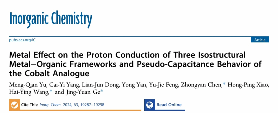 相关研究成果以“Metal Effect on the Proton Conduction of Three Isostructural Metal−Organic Frameworks and Pseudo-Capacitance Behavior of the Cobalt Analogue”为题,近日发表在《Inorganic Chemistry》期刊上,我院2022级硕士研究生余梦倩为第一作者,温州大学为第一通讯单位,陈忠研博士、王海英副教授和葛景园副教授为共同通讯作者。该工作受到国家自然科学基金(21801054和21801127)、温州市基础科研项目(G2023012)和浙江省基金项目(LY20B010003)的资助。